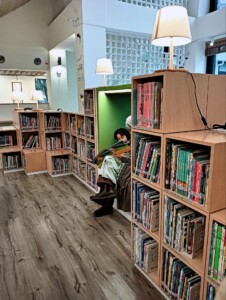 方圓書房創辦人張羽芳遇見志趣相投的先生佘益源,夫妻倆一起圓了夢,在故鄉開了一間溫馨的書房,店名是從張羽「芳」和佘益「源」各取一字的諧音,而「方圓」又有宇宙的意喻,形容夫妻倆的文學小宇宙。走進方圓書房,長形街屋式建築映入眼簾,前端是書架陳列,中間是辦活動的空間,在這裡除了靜態書籍展售,書房也舉辦各類活動,像是每月一次的青少年讀書會、繪本分享會、烘焙課程等,吸引不少大小朋友參與。