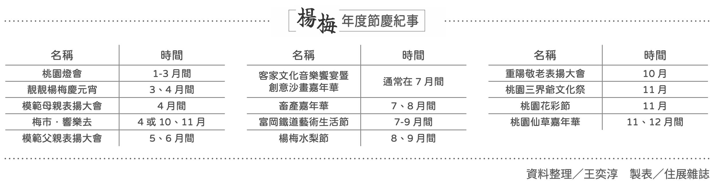 每逢元宵節,桃園市府單位都會指導、承辦該活動,以特色踩街表演及元宵晚會2大主軸,邀請楊梅區各里、各社區發展協會,以及在地居民都會組成專業表演團體共襄盛舉,期待讓各位居民之間的關係更加緊密,提升當地優質生活環境。