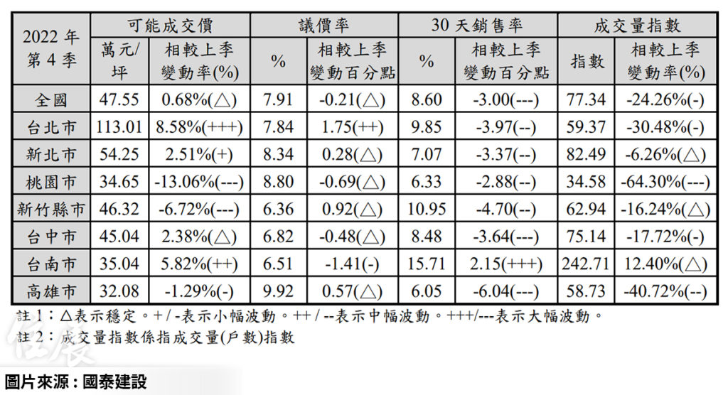 國泰建設發布全國房地產指數,2022年第4季指數相較前季為價穩量縮,與2021年相較同季為價漲量縮。本季成交價、議價率、推案戶數及推案金額皆維持穩定,銷售率及成交戶數皆大幅減少。