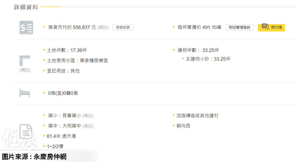 根據《永慶房仲網》資料,這座透天樓高兩層,主建物坪數約33.25坪,土地坪數約17.39坪,建築外觀明顯有鐵皮增建,屋齡約61年;位於第三種商業區土地上,目前開價1億6329萬元求售,換算土地單價約961萬元。