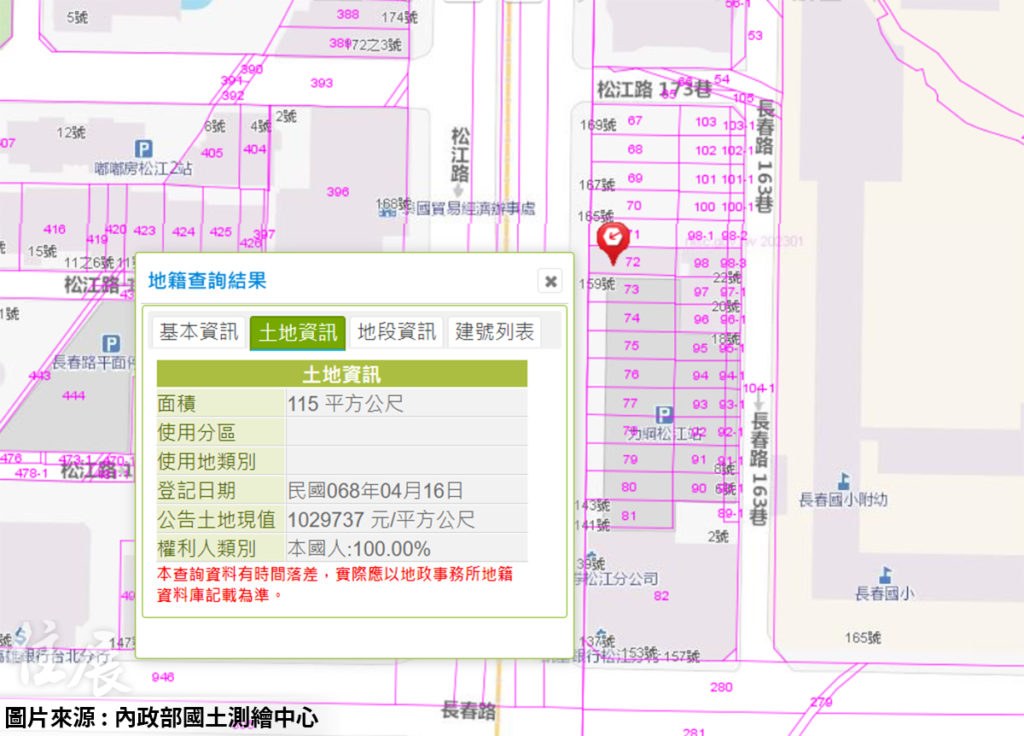 根據內政部資料,該地號面積實為115平方公尺(約34.78坪),而出售中的土地只是權狀登記的一半。網友好奇是否新聞與房仲網都寫錯了?(圖/內政部國土測繪中心)
