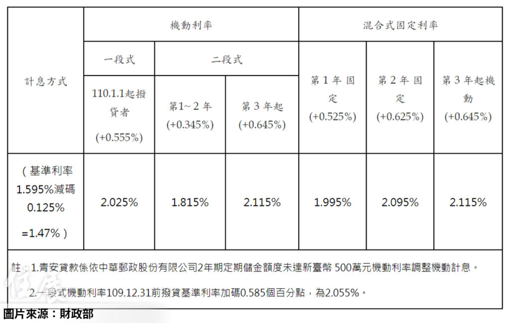 財政部表示,青安貸款利率選擇包括一段式、二段式機動利率及混合式固定利率三種,青安貸款現行利率計算如下表,民眾可依資金狀況及還款規劃擇適辦理,惟貸款利率計息方式一經選定不得要求變更。