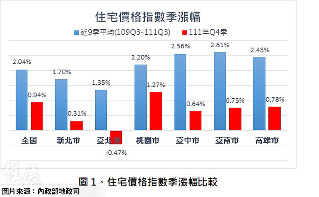 內政部今(11)日發布2022年第4季住宅價格指數,本季全國住宅價格指數為127.51,較第3季微幅上漲0.94%,為2020年第3季以來季漲幅首次小於1%;在6都中,台北市下跌0.47%,是2020年第2季以來首見下跌,其餘5都上漲趨勢也明顯收斂。