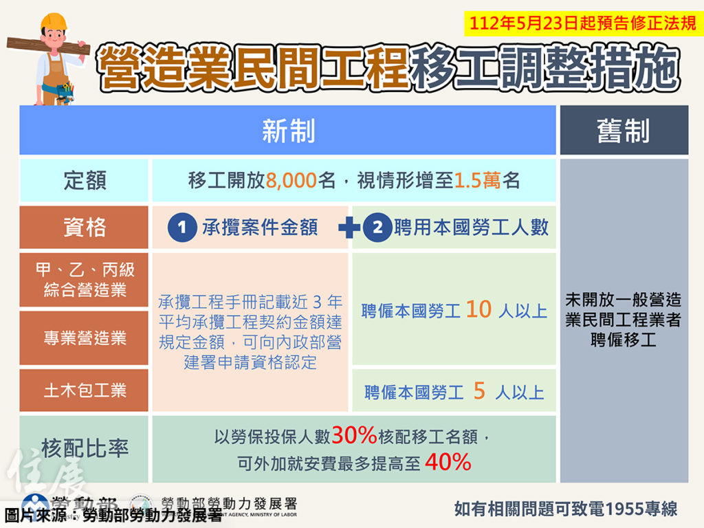 為協助解決產業缺工問題,勞動部23日發布新聞稿,預告將調整聘僱移工資格。其中營造業部分,民間工程業者在符合承攬案件規定金額與聘僱本國勞工人數雙門檻下,得以30%比率聘僱移工。初期先開放總額8千名、視情況開放至1.5萬名,最快6月中可適用。