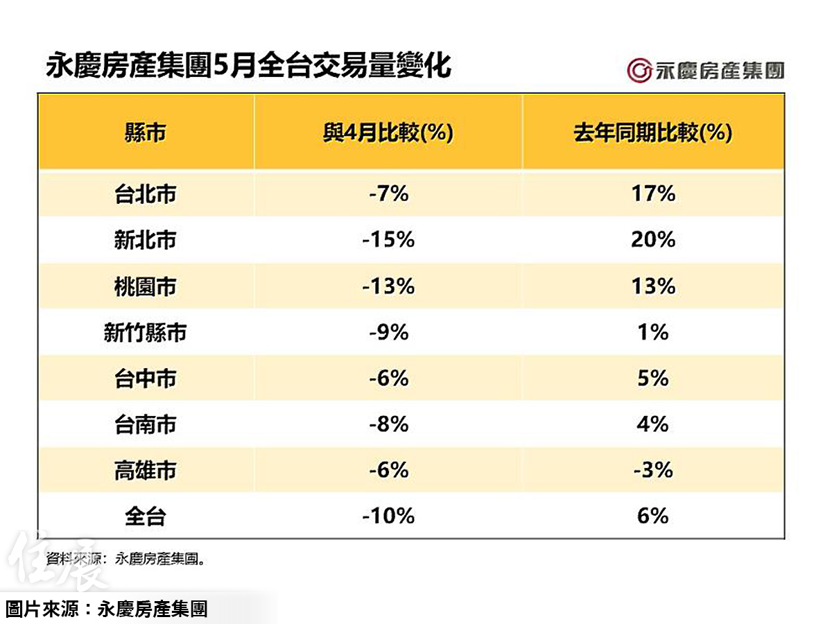 國內景氣燈號連六藍,出口年增率也出現連八黑,今年經濟成長率預估驚險保2,民眾購屋態度轉趨觀望,台股近期站上萬六大關,消費者信心止跌回升,購買耐久財指標轉趨樂觀,加上通膨預期,讓屋主對未來房價持樂觀態度,讓價意願低,甚至出現部分屋主惜售的狀況,買賣雙方價格認知難有共識,也讓5月全台交易量較4月減少1成。根據永慶房產集團內部成交資料統計,相較於4月份,台北交易量下降7%,新北下降15%,桃園減少13%,新竹量縮9%,台中減少6%,台南與高雄則分別量縮8%與6%。