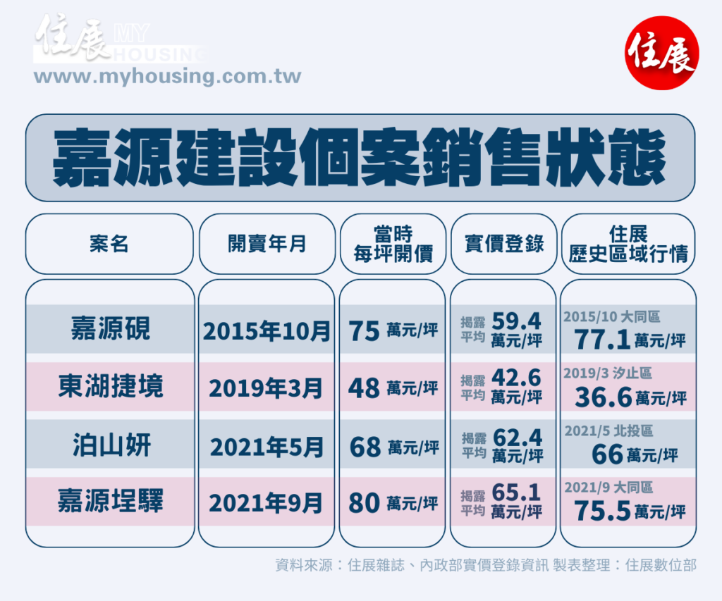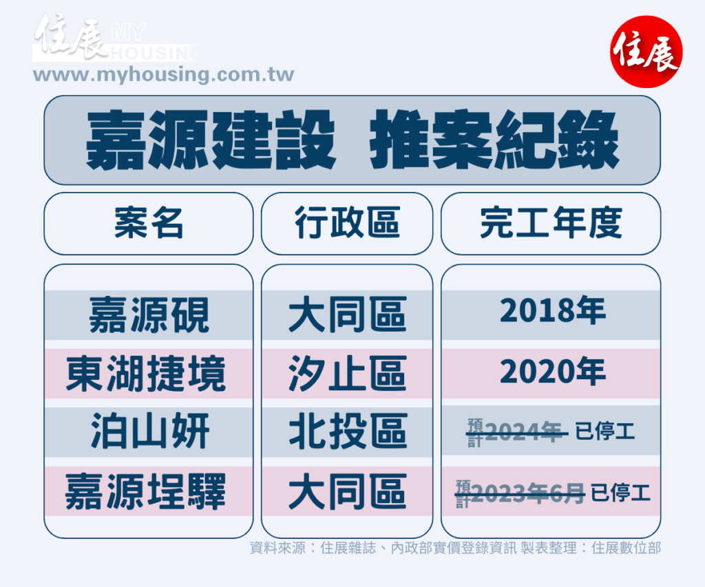 根據住展雜誌調查,嘉源建設過去主要在雙北市推案,2015年曾在北市大同圓山一帶推出預售案「嘉源硯」,基地74坪,總規劃9戶2至3房產品,總銷約2.4億元,並在2018年以成屋型態銷售。2019年則在新北汐止康寧街推出預售案「東湖捷境」,基地135坪,總規劃38戶,主力為18至23坪的1+1房型,公設比36.8%,總銷約2.5億元,2020年成屋繼續銷售。