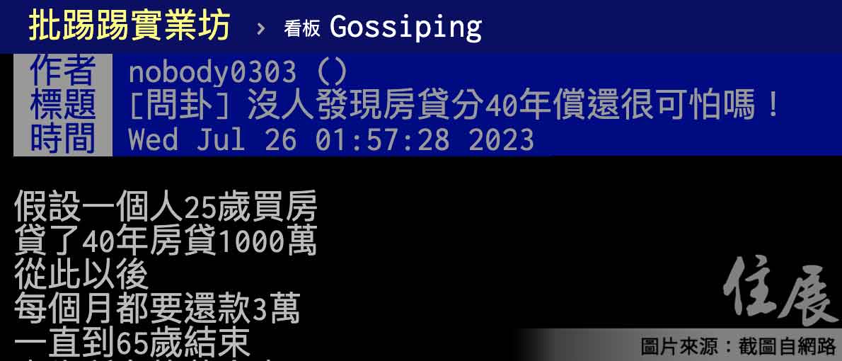網友在PTT八卦板以「沒人發現房貸分40年償還很可怕嗎!」為標題發文指出,假設一個人25歲一千萬貸款分40年還清,加上其他費用每個月還貸款,人生整個黃金歲月直到退休年齡還在還,「根本廢到笑」,萬一還不出來,瞬間失去房屋所有權,大嘆不合理。
