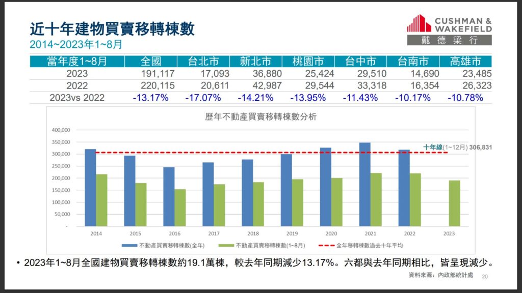 根據內政部統計處資料顯示,今年建物買賣移轉棟數,1至8月累計共約19.11萬棟,相較去年同期下降約13.17%,六都與去年同期相比,皆呈現減少,其中又以台北市跌幅最高為17.07%。戴德梁行預估今年全年約27至28萬棟,相較去年31.8萬棟,預估跌幅約12至15%。