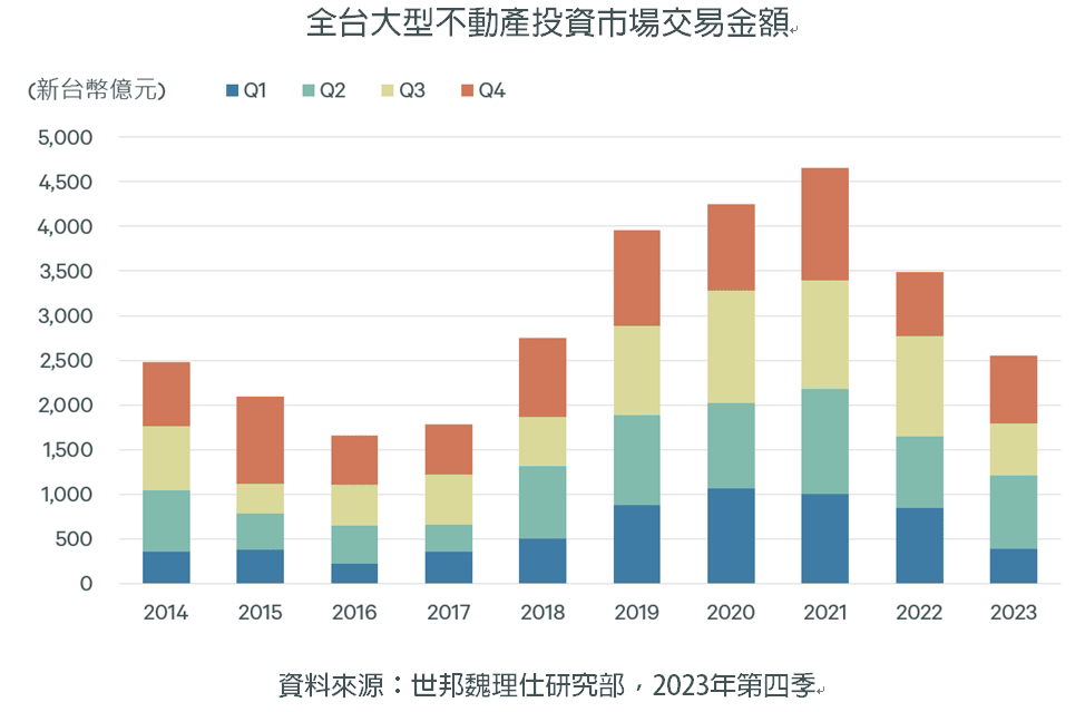 根據世邦魏理仕研究部統計,截至12月17日為止,2023年全台大型土地及商用不動產成交金額總計近2,558億元,較去年同期下滑23%,主要因為土地市場大幅降溫,建商因受到貸款限制、房市震盪等利空因素影響,購地力道明顯減弱。