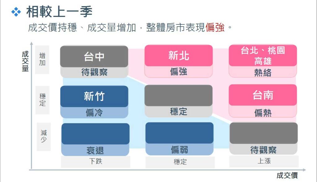 台北市:成交價大漲,因推案戶數9成為單價110萬元以上的產品;因素地稀缺,危老都更案頻創高價,精品小宅總價控制產品成為推案趨勢,形成單價上漲、戶數上升現象。整體較上一季價量俱漲,房市表現熱絡。