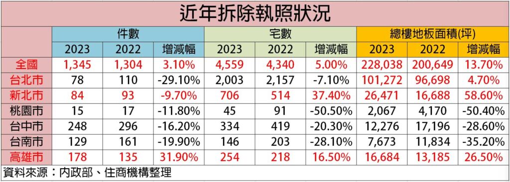 再來看另一個數據統計,根據內政部最新資料2023年全台拆除件數為1,345件,高達4,559宅,拆除面積22.8萬坪,呼應前述全台平均屋齡的統計,台北市正因屋齡最老,因此在此次拆除宅數與面積統計中同樣居冠,甚至佔全台逾4成,此外新北市拆除宅數與面積成長率最大,而高雄市在件數成長頗為耀眼。
