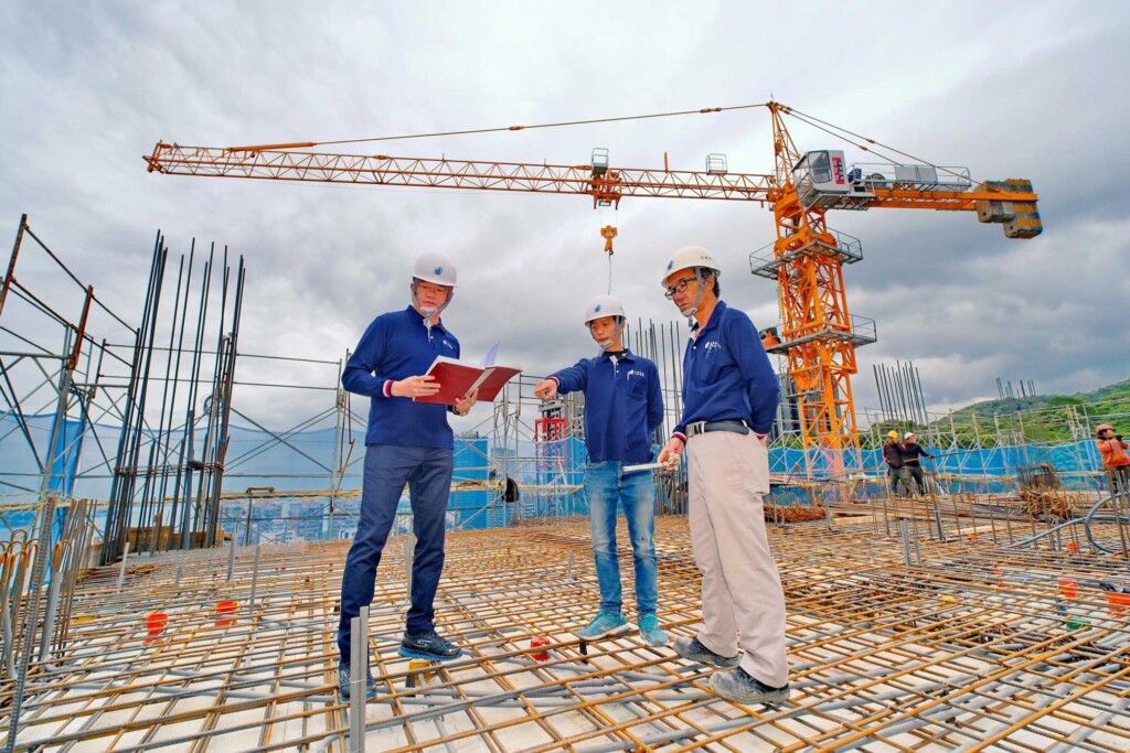 大家地產董事長卓家雄(左一)於營造案監督品質,圖片大家集團提供