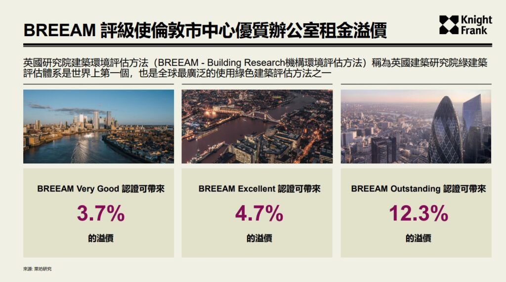 首先,針對全球不動產資本動向及ESG趨勢,萊坊亞太區市場研究部主管李敏雯表示,整體來說,2024年亞太地區的商用不動產市場表現令人期待。辦公大樓交易活動雖然不如以往,但在亞太地區仍是投資的首要類型,交易量佔30%;交易量第2名的則是工業不動產,佔29%,新加坡的物流市場表現則超越長期平均,是2020年以來最佳;住宅方面同樣達到2020年以來最好的表現,尤其是澳洲、日本和大中華地區;零售及飯店不動產亦將迎來表現相對熱絡的1年。 李敏雯分析,萊坊研究ESG趨勢對商辦市場的綠色溢價,該項研究已持續8年,共6千多個項目,結果顯示倫敦市中心的優質辦公大樓的租賃市場中,擁有BREEAM Outstanding建築物的租金溢價為12.3%;BREEAM Excellent溢價為4.7%;BREEAM Very Good溢價為3.7%。同樣的溢價也出現在買賣不動產買賣市場,BREEAM Excellent的商辦溢價為10.5%;BREEAM Very Good的商辦溢價則是10.1%。