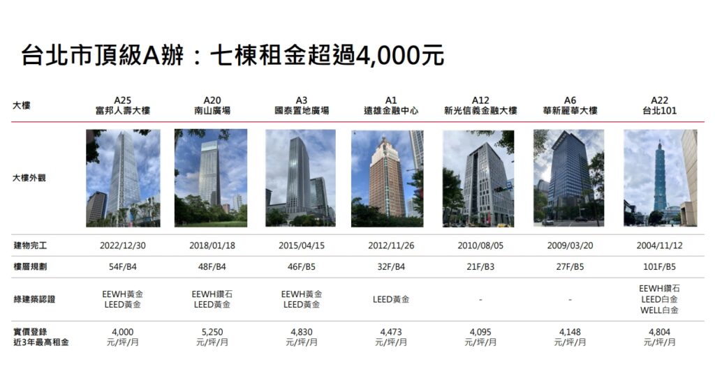 台北市頂級A辦,7棟租金超過4,000元/坪/月,資料來源:瑞普萊坊。