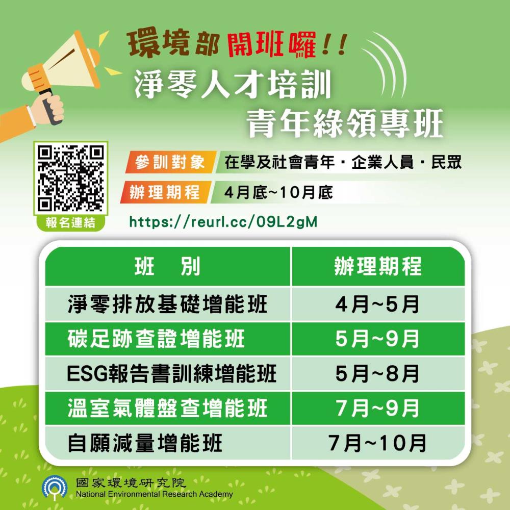 有鑑於企業對於綠領人才需求大幅提升的需求,環境部國家環境研究院(簡稱國環院)預計自今年4月起,辦理一系列淨零排放技術訓練課程,首波課程「溫室氣體盤查作業查驗人員訓練班」,主要針對溫室氣體查驗機構,據統計目前已有14家合格單位,該課程62個名額目前也已額滿。