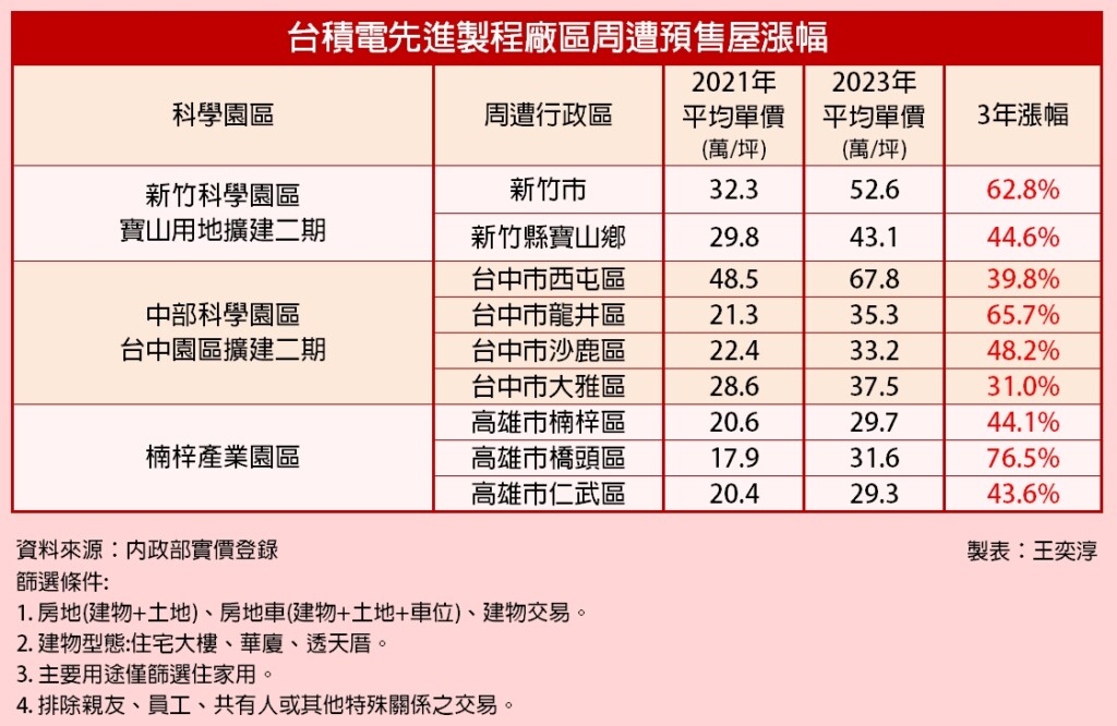 台積電具備相當的人口紅利,為房市帶來的影響有目共睹。根據內政部實價登錄顯示,在與台積電廠區有區域關係的新竹寶山、台中西屯,以及高雄楠梓等地,近3年預售屋平均交易單價普遍都有高於40%的漲幅,其中更以橋頭區逾70%居冠;另外,即將設立先進封裝廠的嘉義科學園區,周邊縣治特區的預售屋交易狀況也傳出佳績,台積電對於區域房市的影響可見一斑。
