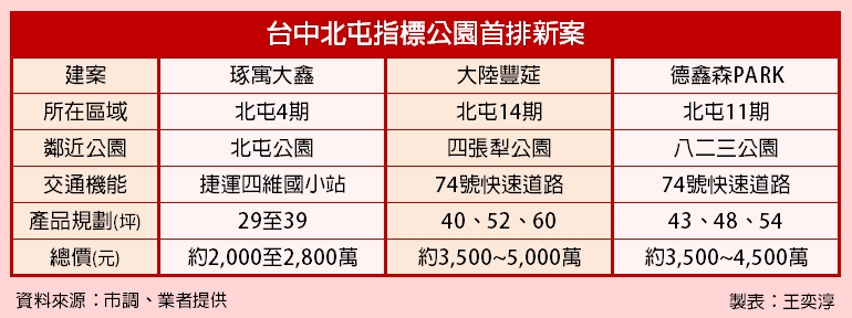 以台中市公園腹地多的北屯區為例,區域內具備捷運綠線與公園第一排優勢的大鑫『琢寓』、首度布局14期的大陸『豐莚』、11期新案『德鑫森PARK』,以上3大指標案皆享公園第一排的景觀視野,備受矚目。