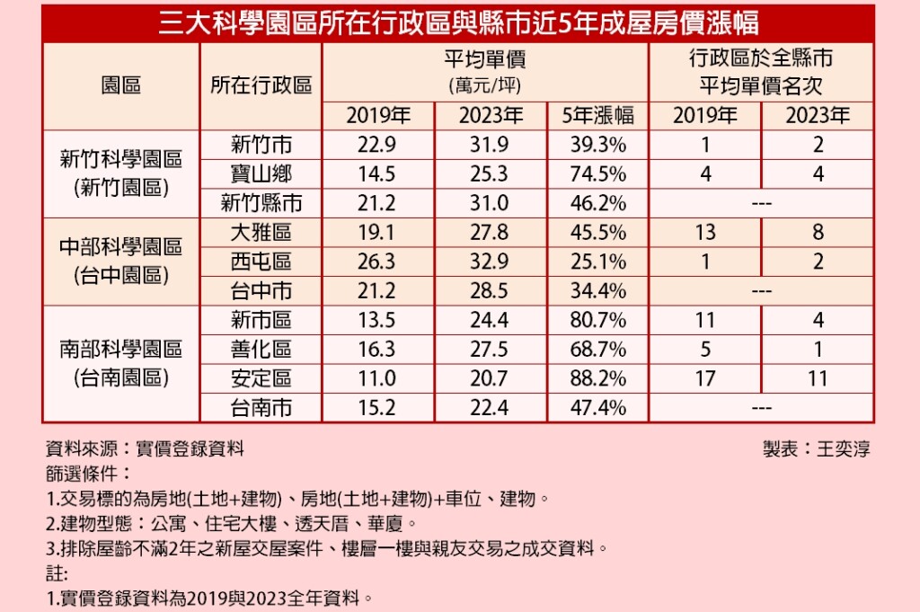 觀察2019年至2023年期間,三大科學園區所在行政區與縣市成屋單價漲幅的變化,發現以南科台南園區周遭房價漲幅最為突出,台南市的安定、新市區更是在5年間達8成以上的漲幅;而同樣受惠於園區題材,新竹縣寶山鄉近5年漲幅也逾7成。