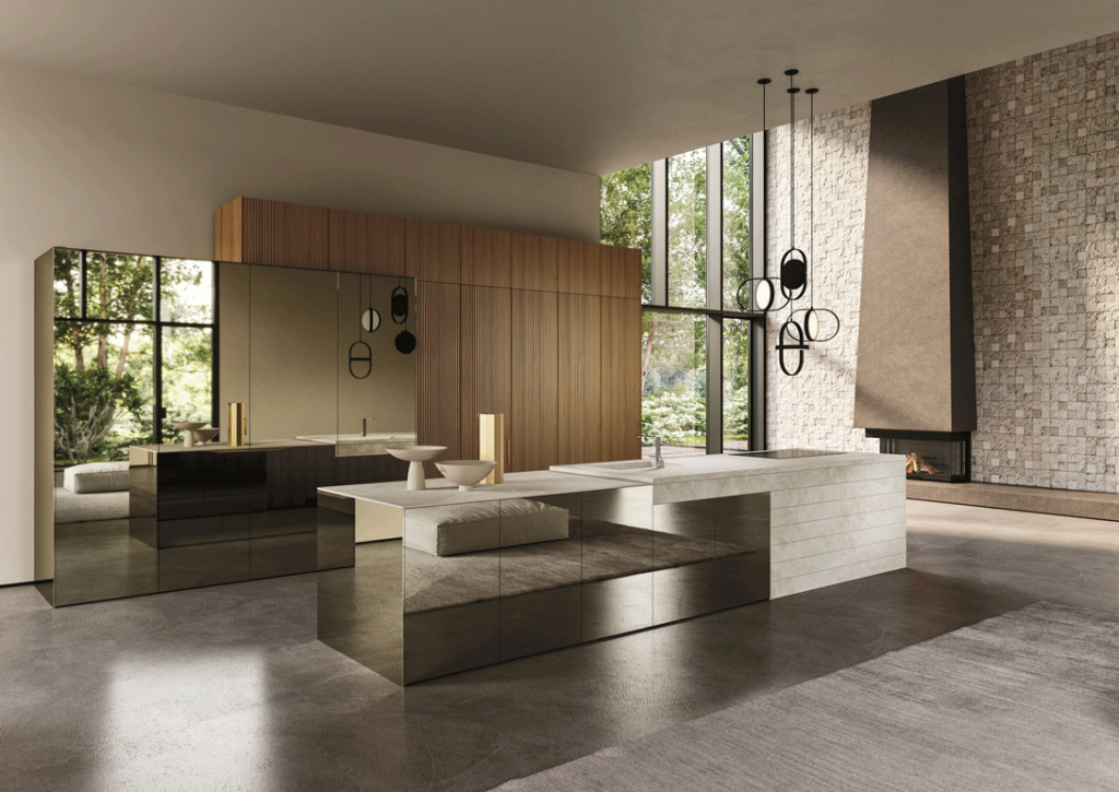 2024年新發表的ELEMENTI系列,採用PVD鏡面不銹鋼門板,為整體空間帶來了全新的美學感受。後方高櫃的異材質結合創造個性且吸睛的非凡場景,鏡面不銹鋼門板與胡桃木,以高低錯落之勢,將周圍環境中的景物投映其中,呈現融合功能、美感的科技感中島廚房。