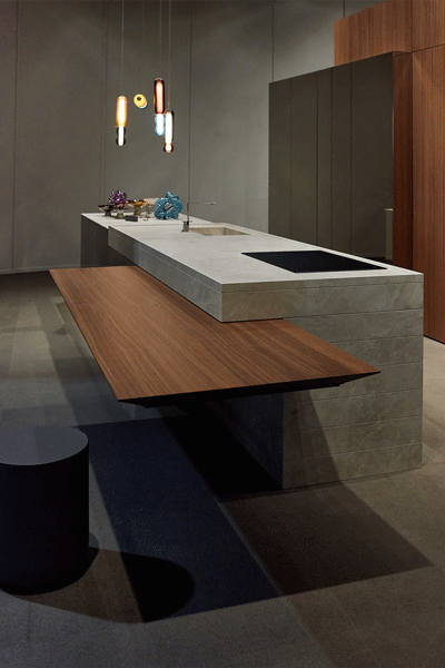 巨大的ELEMENTI中島映入眼簾,側板上的水平槽線既能隱藏側板和頂部之間的接縫,也營造出俐落的線條感,邊緣30度角斜切入的溫暖木質吧台,中和石材帶來的冷冽感,檯面180×60 cm承重580公斤。