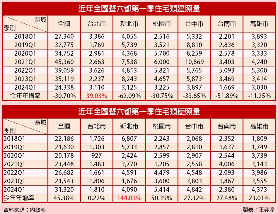 根據內政部統計,全國今年第一季住宅類建照核發數量達2萬4338戶,為2018年以來最低的數量。其中,減幅最大為新北市,年減6成僅達約3125戶;反觀台北市則年增近4成達3110戶,與新北市相差無幾。