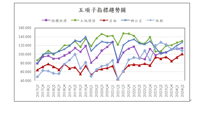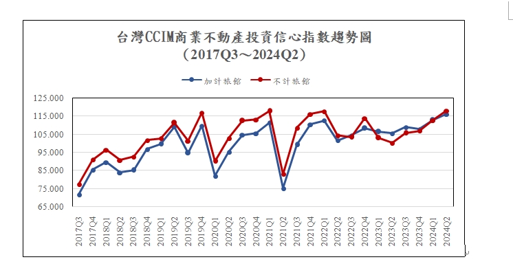 台灣CCIM公布第二季商業不動產投資信心指數,總平均指數為118.20點,較前一季上升5.24點,創下歷史新高。一共參考四大指標包含辦公室、店面、土地開發、總體經濟,指數上升顯示市場偏向樂觀的信心水準。其中土地開發為信心最高,其次則是辦公室。