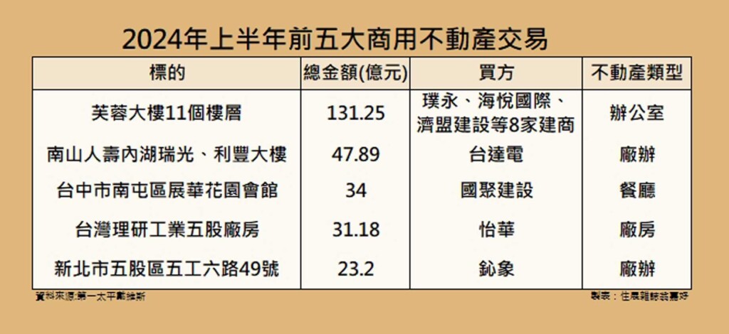 上半年商用不動產交易中,辦公室規模排名第一,總額達237億元,占比達36%,投資型買方為購買主力。其中,最大筆辦公室交易為海悅國際等多家開發商,共同購置仁愛路的芙蓉大樓,交易金額達131億元,換算土地單價每坪1,526萬元,開發商將整合重建為豪宅產品。