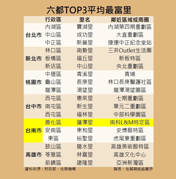 值得關注的是,六都平均最富里是由台南南科L&M特定區的蓮潭里拿下,住商不動產新市南科加盟店店東黃睿禹分析,區域街廓環境單純,又鄰近園區,且區域購屋主力的科技人,也非一般受薪階級,早在2019至2020年間南科開始發展時,就有一批從新竹科學園區下來的科技產業主管移居,久而久之逐漸形成富人聚落。