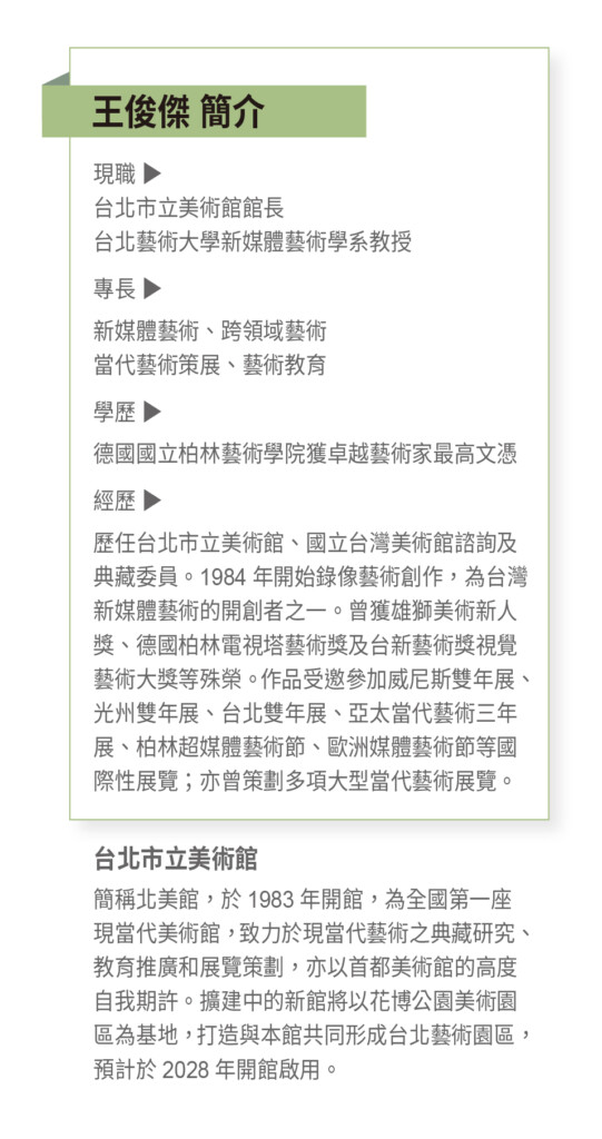 藝術家善用人們感興趣的方式,透過創新表現手法,將最真實的社會現象以不同型式呈現在觀眾面前,而王俊傑的身分從藝術家一路轉換,歷經電影劇場評論家、記者、策展人、北藝大教授,到如今的北美館館長,不同階段、身分所積累的能量,都讓他在接手北美館館長後,能更有餘裕的發揮所長。