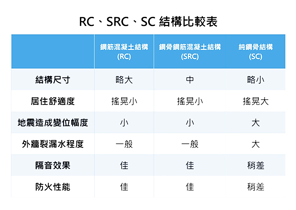 在地狹人稠的市區,抬頭可見不少建案與天爭地,一棟棟高樓大廈如雨後春筍般建造,隨著新型建築材料的生產、施工技術的進步、結構方法的發展,都為建築設計帶來更多的靈活性。目前台灣常見的建築結構形式包含RC(鋼筋混凝土結構)、SRC(鋼骨鋼筋混凝土結構)及SC(純鋼骨結構),隨著建築法規不段調整修改,SRC及SC工法意外竄紅,銷售上更主打「制震」、「耐震」宅吸引購屋族,也因此意外主導消費者對於「建築安全」最基本的正確認知。究竟建築業者是建造一棟外表富麗堂皇、出入尊榮氣派,卻未必能確保真正安全的「豪宅」?還是建造一棟真正內外兼具,有好的規劃設計和好的施工品質,採用實質抗震且不避擔憂日後大理石、磁磚掉落風險的真正安全安心「好宅」?   除了建築外在的考量,更應該重視建築物本身的抗震能力,並在建築的耐震構造與建材設備上多加著墨。RC、SRC、SC其實只是材料上應用的不同,依個案規劃建築結構怎麼選擇、各結構會有那些不足應適當補強,加上精準確實施工發揮安全效益,才相對更顯重要。