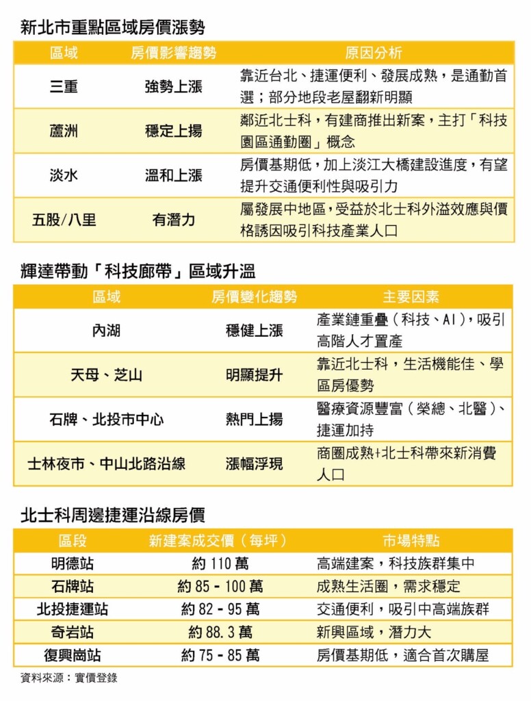 目前北士科已有新光、仁寶、中鼎工程等知名企業搶先插旗,如今再加上輝達,無疑是錦上添花,張世宗指出,輝達海外總部選擇落腳北士科,預期將帶來三大房市效應,首先,輝達的進駐可望吸引大批高薪科技人才的湧入,直接推升區域住宅需求和房市交易量能;其次,隨著企業總部與供應鏈上下游陸續進場布局,產業聚落效應將進一步強化,並帶動商辦市場熱度攀升;第三,隨著北士科新案房價已經突破百萬大關,也有望加速石牌、北投原本多為屋齡偏高的老社區,在輝達進駐利多帶動下,吸引建商進行都更與危老案申請,加速區域改建速度。另外,也對新北市造成明顯的輻射帶動效應,部分具備交通優勢且房價值更親民的周邊區域,如社子島、三重、蘆洲及淡水等地,也有機會成為科技新貴購屋與租屋的外溢熱區,後續發展值得關注。
