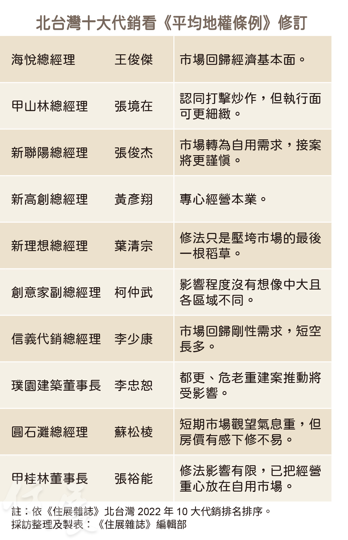 「沒有異議,照案通過。」內政部公布修法後第三百九十七天,立法院內,議事槌響,《平均地權條例》修正案三讀通過。 有別於近一年來產業界質疑聲浪不斷,修正案通過當下,院會氣氛平和,各黨派立委罕見立場一致,紛紛手持看板,輪流上台發言,有立委談及居住正義與土地徵收,也有立委重申此次修法是「打炒房不打房」,不會影響市場正常交易。 事實上,此次民意最高殿堂未見激烈言詞交鋒,倒也不足為奇,因為修法內容多次出現轉折──限制換約新增例外情形、刪除炒房關三年條款、放寬私法人取得都更危老分回戶免經許可後,修正案對市場的衝擊力道逐漸減弱,後續內政部定調限制換約不溯及既往,更延長投資客退場時間,減輕市場短期賣壓。以致於所謂「打炒房五重拳」已名過其實,當前不確定因素,只剩子法及施行細則未定。 《住展雜誌》為讀者盤點平均地權修法歷程,並實際訪問堪稱海嘯第一排,接案總量占北台灣總推案量高達四九.六%的北台灣十大代銷業者,解析房地產市場後續發展趨勢。