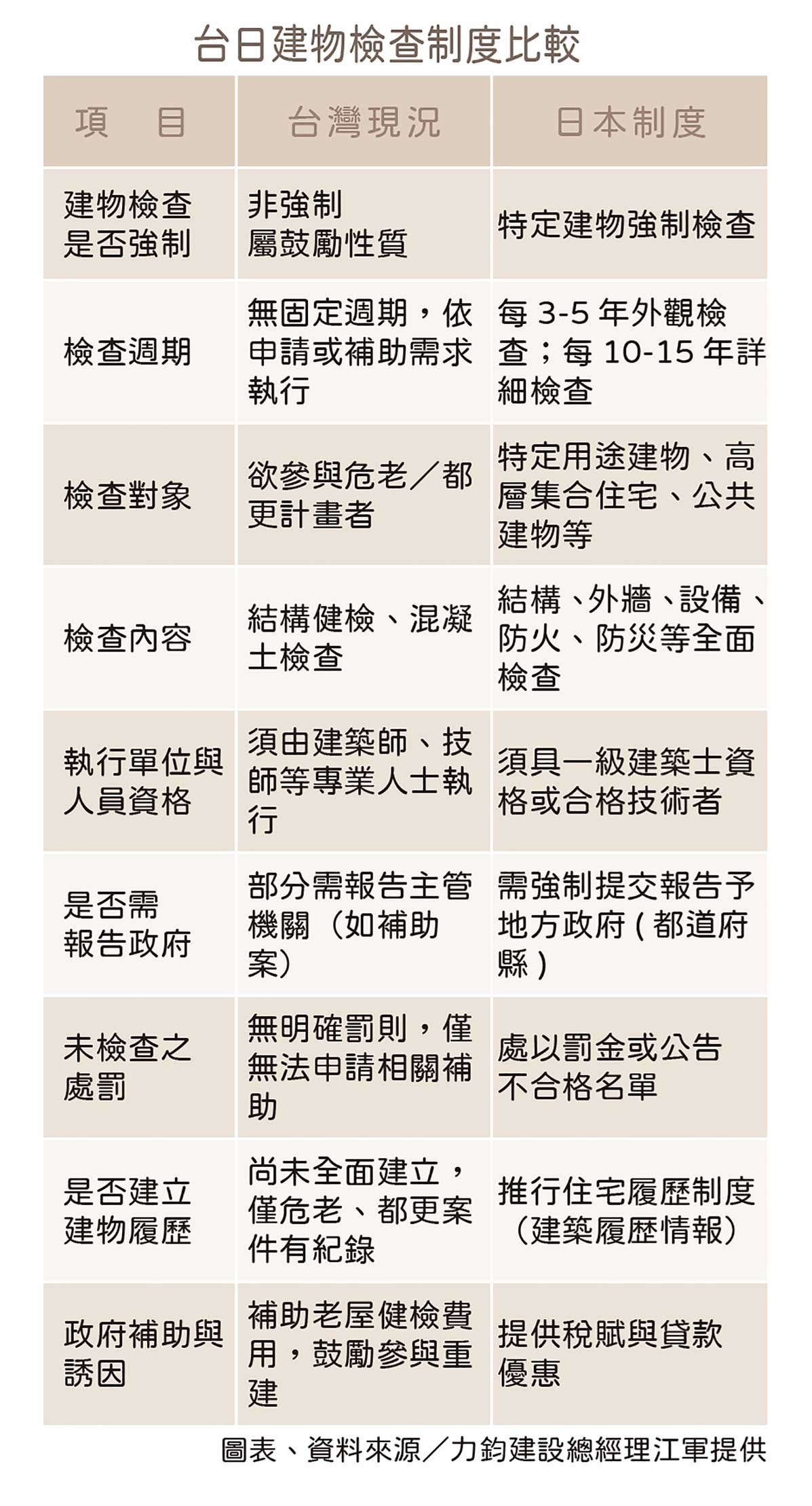 對於如何建立更具體與可執行的制度架構,產業界也提出了更具體的參考建議。長期關注日本耐震制度的力鈞建設總經理江軍建議,台灣可參考日本推動「強制性老屋體檢制度」,針對屋齡30年以上的集合住宅與公共使用建物,導入定期結構檢查,並透過補助、稅賦減免等誘因,鼓勵屋主進行耐震補強與外牆更新。