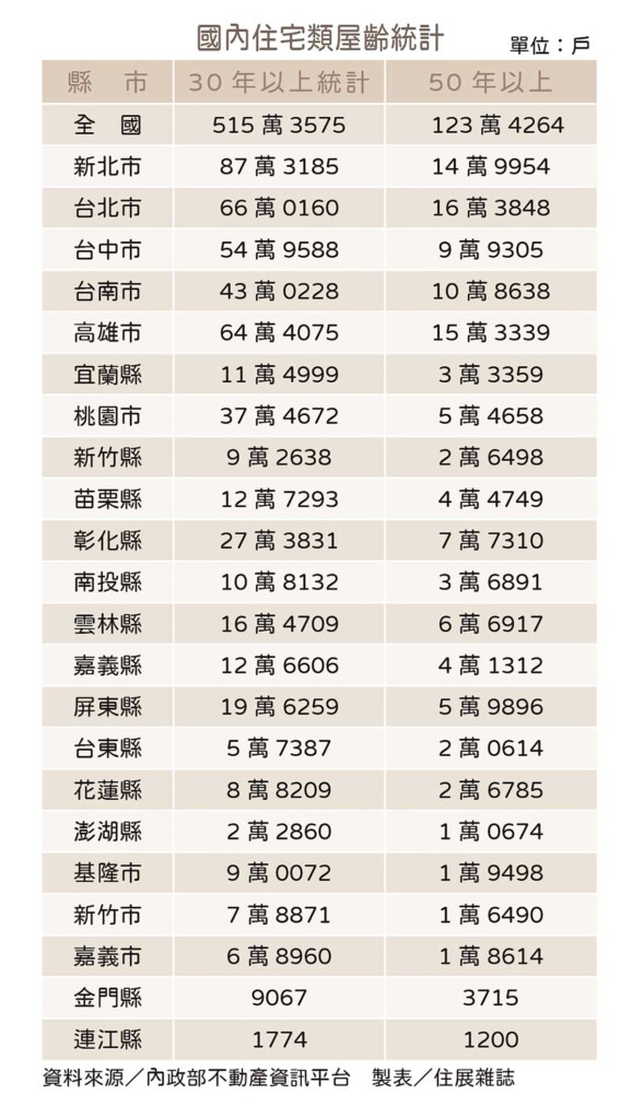 而全台目前屋齡三十年以上的老屋已超過500萬戶,當中又有123萬戶是在尚無耐震規定下所興建(編按:即屋齡50年以上,我國針對建築物耐震設計的法規,是從1974年起才正式納入法規中),這些老屋經過多年風化、地震折損,岌岌可危。