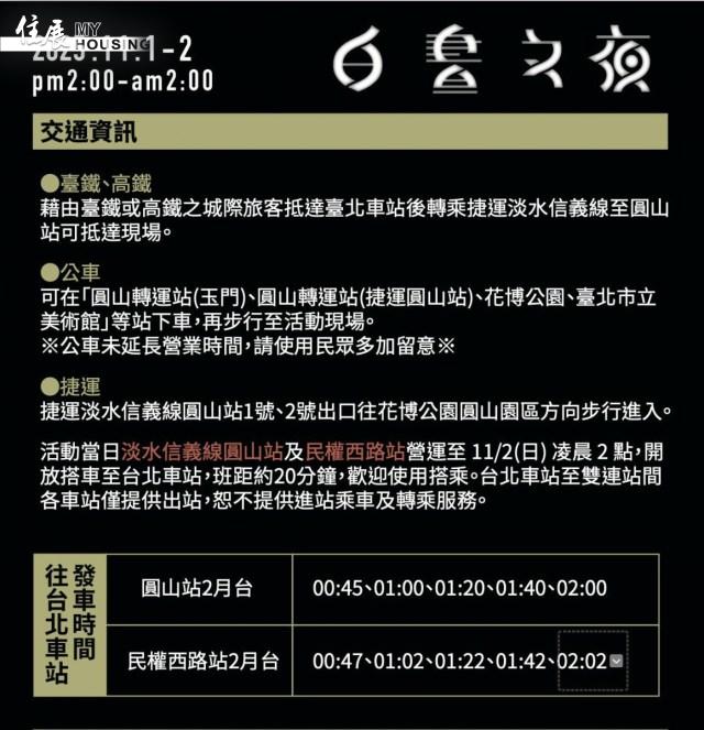 1.捷運延長營運: 淡水信義線圓山站及民權西路站將延長營運至 11月2日(週日)凌晨2時,開放搭乘至臺北車站。