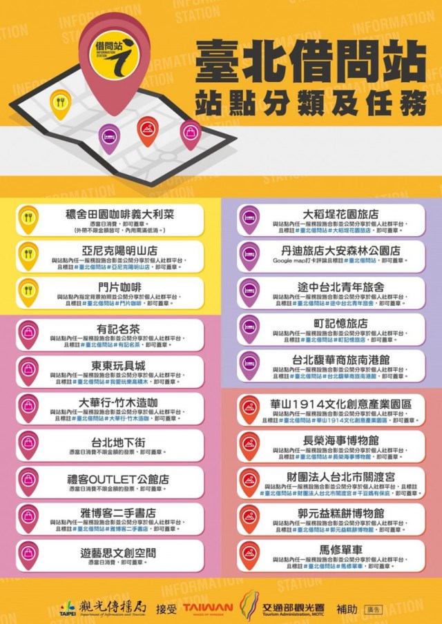 觀傳局進一步說,希望藉此活動,引領更多旅客走入借問站、了解服務功能,進而打造友善觀光,提升旅客旅遊的便利性;而臺北市20處借問站依屬性可分為4種類型,有餐飲類型(食),如門片咖啡、穠舍田園咖啡義大利菜、亞尼克陽明山店等3家;旅宿類型(宿),則如途中台北青年旅舍、大稻埕花園旅店、町記憶旅店、台北馥華商旅南港館、丹迪旅店大安森林公園店等5家;旅遊體驗類型(遊),如華山1914文化創意產業園區、財團法人台北市關渡宮、長榮海事博物館、郭元益糕餅博物館、馬修單車等5家;還有伴手禮與百貨業類型(購),像是雅博客二手書店、東東玩具城、禮客OUTLET公館店、大華行-竹木造咖、遊藝思文創空間、台北地下街、有記名茶等7家。