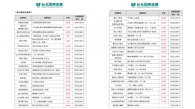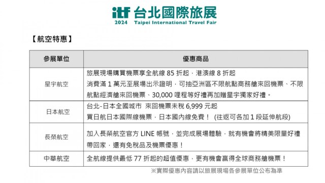 疫後航空客運需求快速成長,今年中華航空、長榮航空、星宇航空、台灣虎航、國泰航空、日本航空、亞洲航空、越南航空、越捷航空等9大航空公司都獨立參展,另有多家航空公司與國家、城市館一同展出,如進駐韓國館的大韓航空、韓亞航空、德威航空、濟州航空、釜山航空、易斯達航空等8家航空業者於展期輪番展出,以及砂拉越展館的汶萊皇家航空,和日本館的天馬航空等。現場不僅有超值優惠機票、精彩表演,還有展場限定神秘禮物與優惠加購。