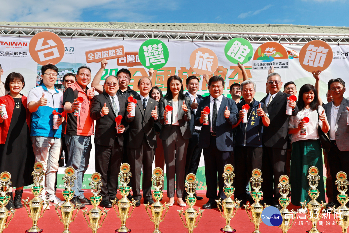 臺灣旅館節全國旅館盃餐旅服務競賽開幕式熱熱鬧鬧,縣長許淑華、交通部觀光署主任秘書方正光、魚池鄉長劉啟帆、南投縣旅館公會理事長李吉田共同主持,魚池鄉飛揚媽媽舞蹈班及澀水打擊樂團開場表演,展現魚池在地文化與熱情。