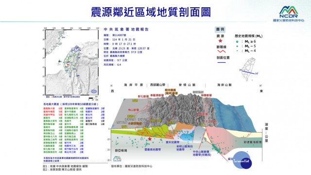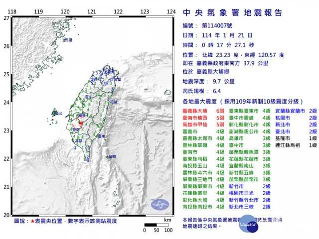 地震通報_01/21-00:17規模6.4嘉義大埔深9km_嘉 6 弱(79.1 cm/s)、高 5 弱(25.09 cm/s)、南 5 弱(16.98 cm/s)、嘉市 4 級、彰 4 級、雲 4 級、投 4 級、東 4 級、花 4 級、屏 4 級、中 4 級、澎 4 級、苗 3 級、宜 3 級、竹 3 級、新北 2 級、竹市 2 級、桃 2 級、北 2 級、連 1 級、基 1 級。[資料來源:中央氣象署] (發布單位:國家災害防救科技中心)