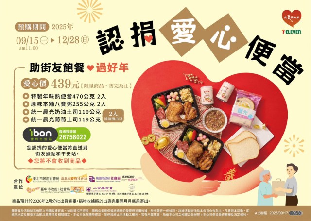 本次認捐活動由統一企業、統一超食代等企業夥伴響應,提供限量的愛心便當組合。每組愛心價439元,內容包含特製熱便當、統一八寶粥與晨光吐司,預計可供應一名街友一日三餐的溫飽。這些充滿溫度的餐食,將透過7-ELEVEN完整的物流系統,送達全台35處據點,包括政府的街友服務中心與人安基金會的平安站,確保及時將溫暖送達最需要的人手中。