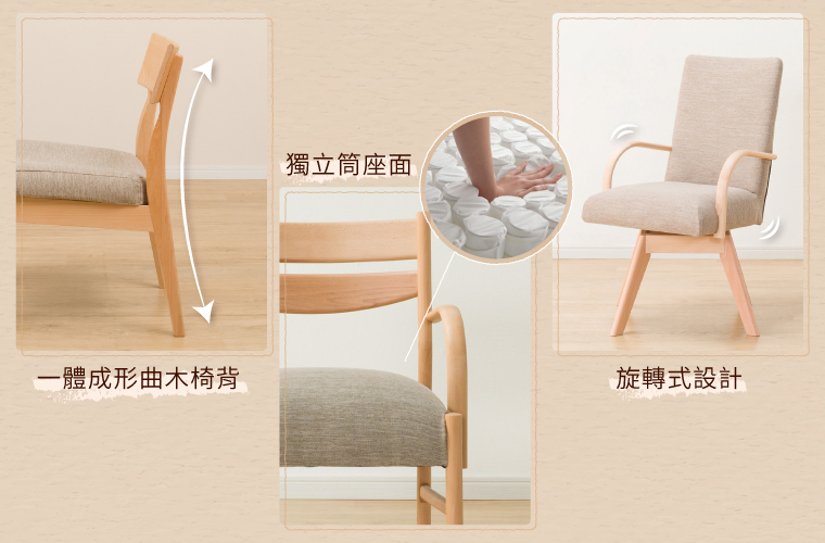 旋轉式設計:增加靈活性和便利性,同時節省空間挪動的不必要浪費,只需輕輕轉動,便能自在起身。