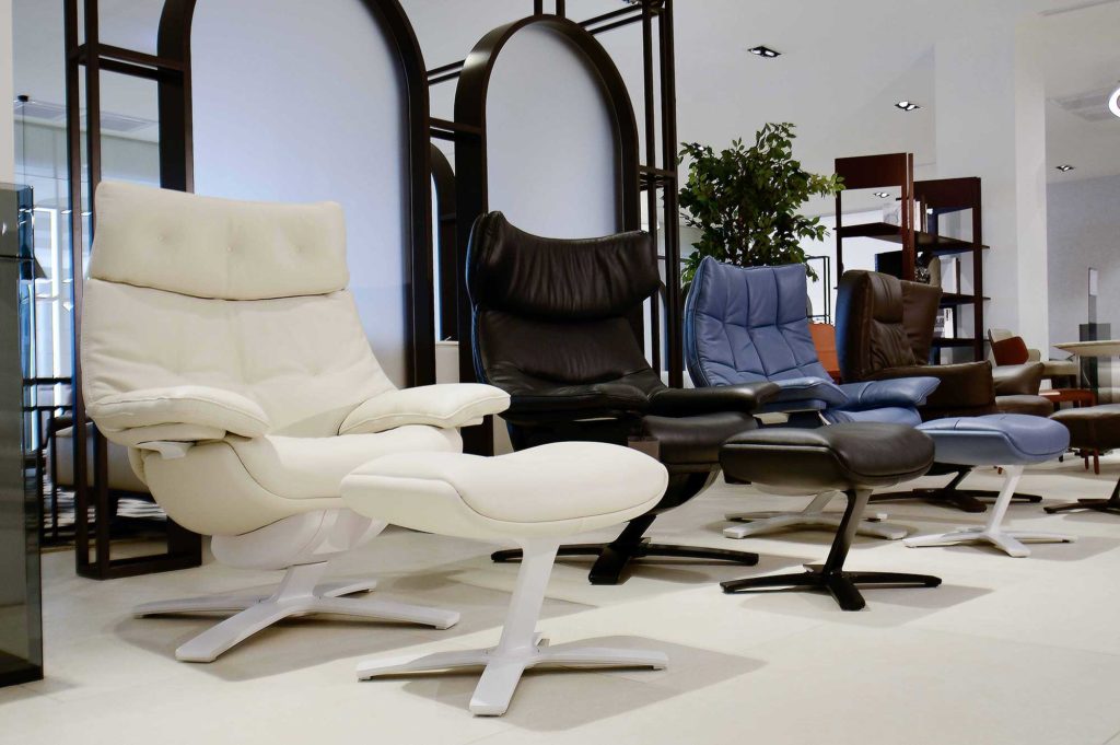 台南旗艦店入門玄關獻上義大利知名建築師與設計師Claudio-Bellini操刀的Pablo,在幾何現代美學與舒適體感之間毫不妥協(NATUZZI提供)