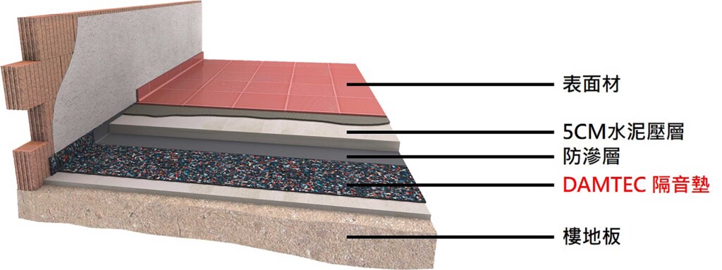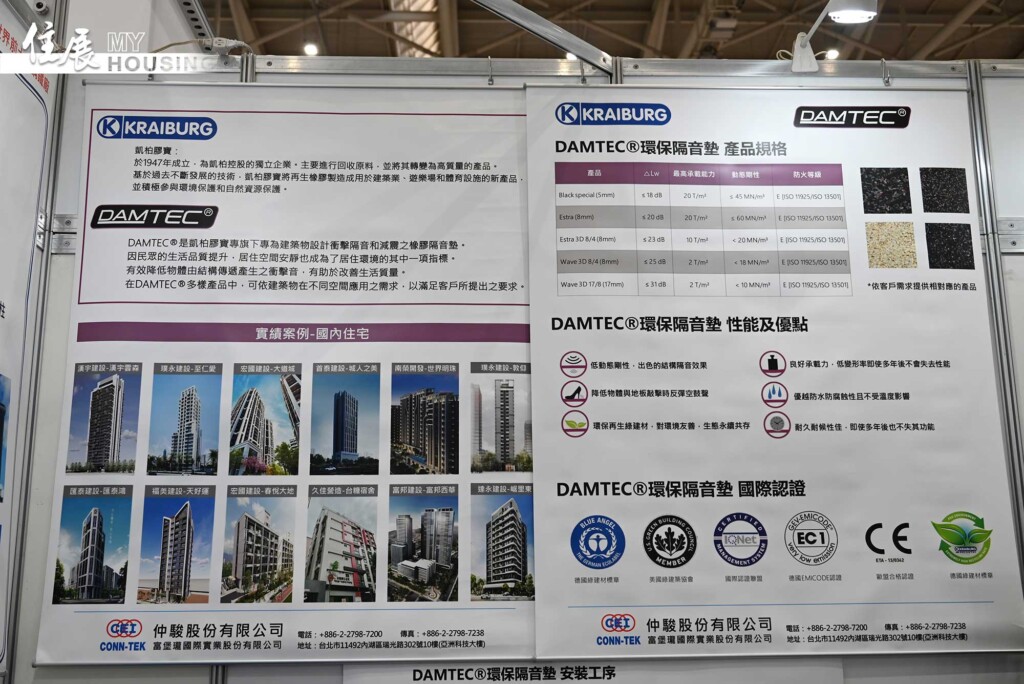 德國KRAIBURG(凱柏膠寶)創立於1947年,擁有近80年的堅實技術,專注於製造高品質再生橡膠墊,產品廣泛運用於鐵道、道路、健身房等場所。「Damtec橡膠隔音墊」為KRAIBURG專為住家減噪而開發,具高彈性、耐磨性、耐老化、不腐敗及不吸水的特性,隔音墊與不織布防滲層一體成形再設計成捲材,讓交接處減少縫隙產生,有效降低樓地板的衝擊聲、行走聲音,以及樓板之間的聲音傳遞。
