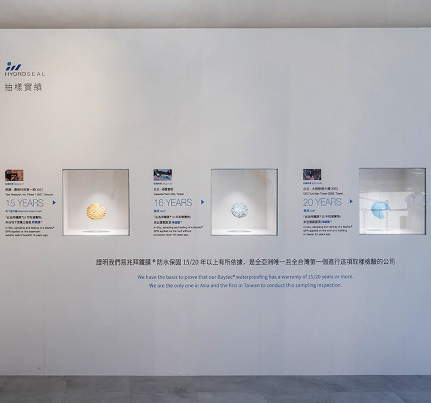這場全球首創的見證會,除了展現易兆防水膜的工程實力外,更重要的是證明易兆在防水膜工程的耐久性。在2022年,現場會同實驗室人員、業主、材料廠商及20年前防水主辦及噴塗師傅,採集2002年於大陸工程總部敦南大樓頂樓噴塗的易兆拜鐵膜防水膜進行現場取樣及實驗室測試,證明經歷20年風吹雨淋、日曬高低溫變化、酸雨、地震,易兆拜鐵膜防水膜無論在防水、抗拉、抗裂、混凝土保護等眾多物性上,仍維持優異的性能,也證明在易兆防水膜在正常使用下,使用年限可望超越30年,甚至40年以上,比起坊間多在2年、5年、10年以下的防水年限久而彌堅。最重要的是讓建設公司能向購屋者提出證明該建案所使用的易兆拜鐵膜防水膜,能突破「內政部於111年5月18日頒布預售房屋定型化契約應記載事項,結構部分漏水賣方負責保固15年」之基本要求。