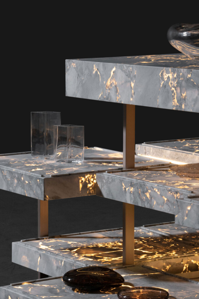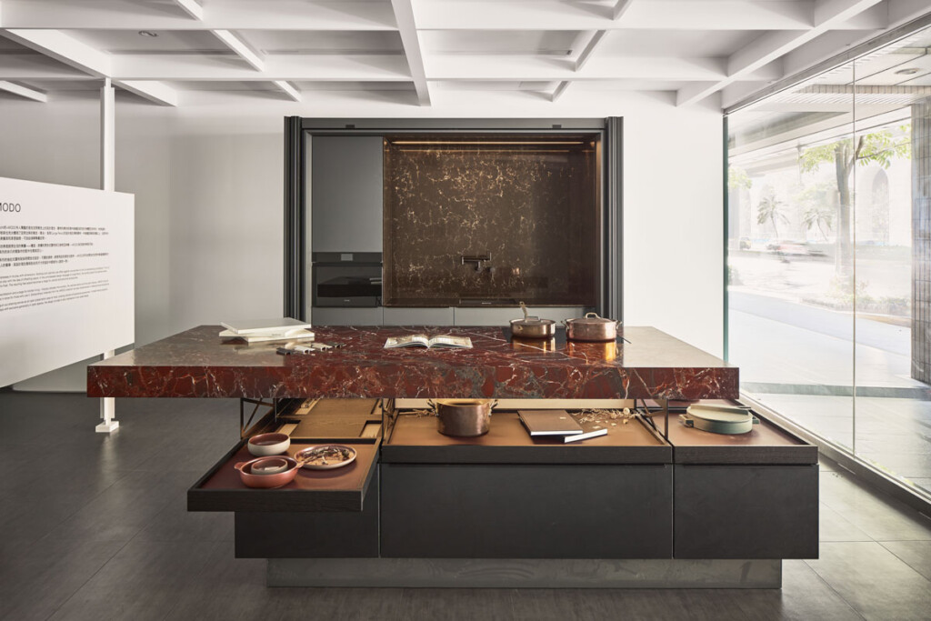 +MODO中島 以檯面及櫥櫃的鏤空設計,搭配暖光形成視覺衝擊;下方實木抽拉盤的結構設計增添收納機能,其創新材料具抗指紋、防滑與熱修復等特色。(德廚集團︱Poggenpohl)