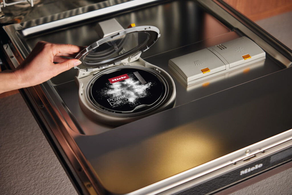 AutoDos智能自動洗劑投放系統 除搭配顆粒狀洗衣粉提高用量精準度外,另獨家結合「PowerDisk All in 1智能洗劑盒」,可視清洗程序及髒污狀態不同,評估洗劑份量並自動投放。(嘉儀企業︱Miele)