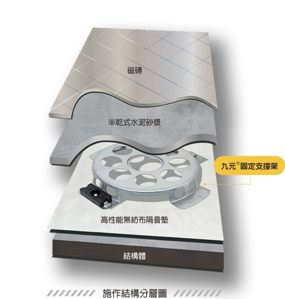 九元®樓板隔音系統將永久隔音層再升級!,除了具備高性能隔音墊外,更重要是搭配專利的九元金屬固定支撐架,此金屬固定支撐架能提供三大功能,可提升樓板隔音構造穩定程度: