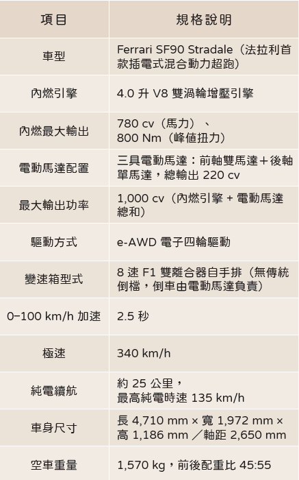 被譽為史上性能最強悍的V8車型跑車,法拉利SF90 Stradale,不只配有三具電動馬達,當中一具更採用了源自於一級方程式賽車的技術,使得最大輸出功率可達1000 cv(馬力),雖然具有極傲人的力量,但這匹「馬」,對知音者卻異常溫柔,它將F1帶入每個駕駛人的生活中,僅需控制在方向盤上的旋鈕,便能從四種動力模式中做出選擇,隨心駕馭各種道路,這份「極速駕馭」精神,也延續到了那些為品味人士打造的生活逸品中。