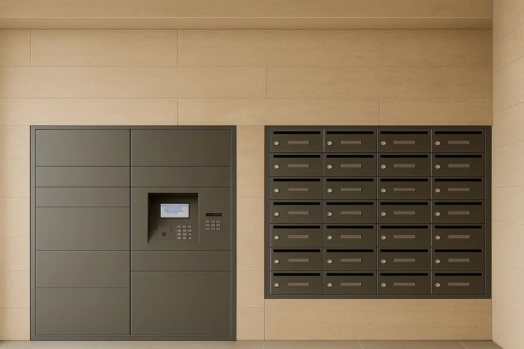 郵件收發區 若設於大廳櫃台旁,能兼顧住戶便利與管理安全。