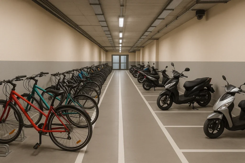 兩輪車停放區 若規劃在監視範圍內,能讓住戶更安心,也降低保全人員巡查壓力。